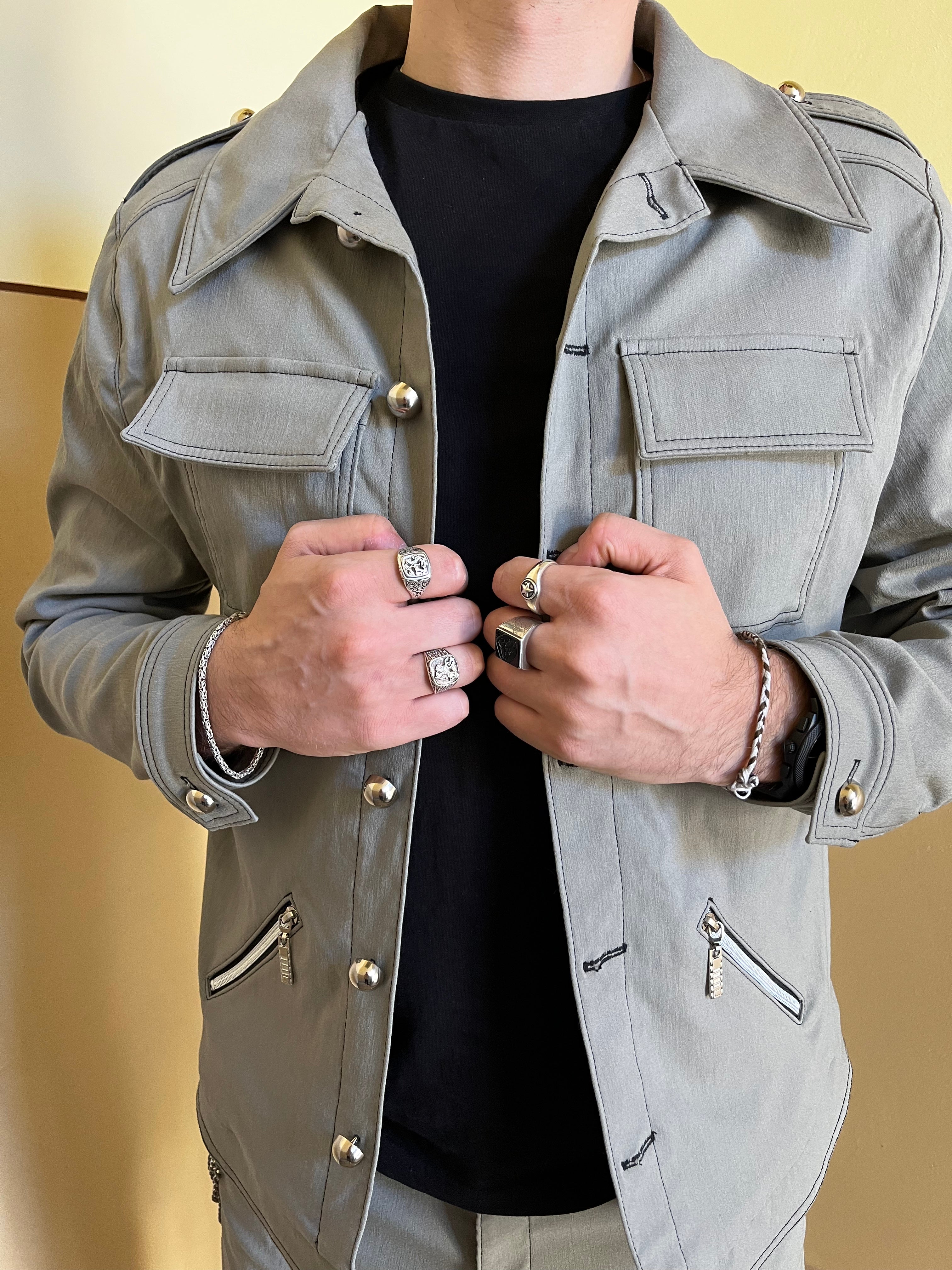 Sötétkék farmer szett, arany ringlikkel dekorálva, hullámos szélekkel