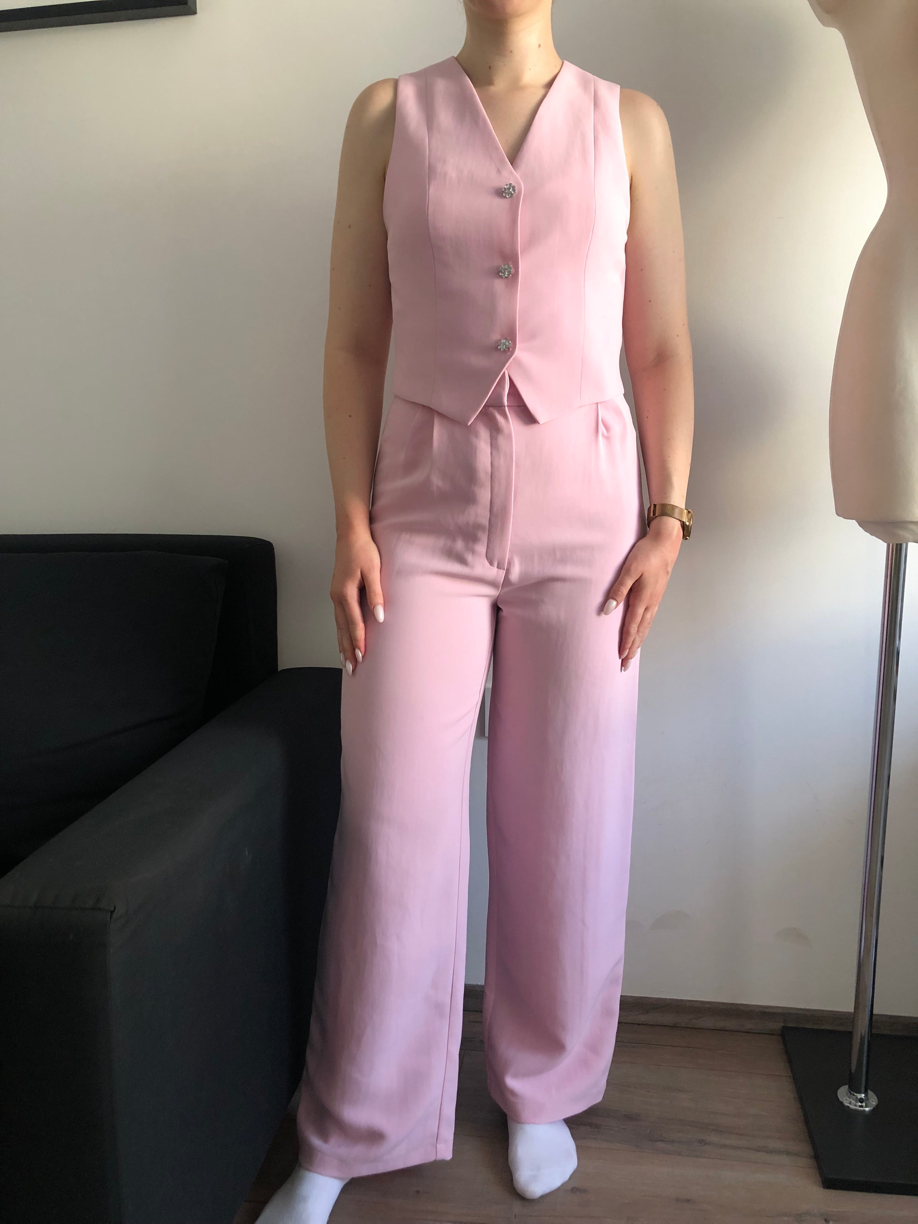 Rózsaszín tencel szövet, bő szárú nadrág és bélelt mellény szett